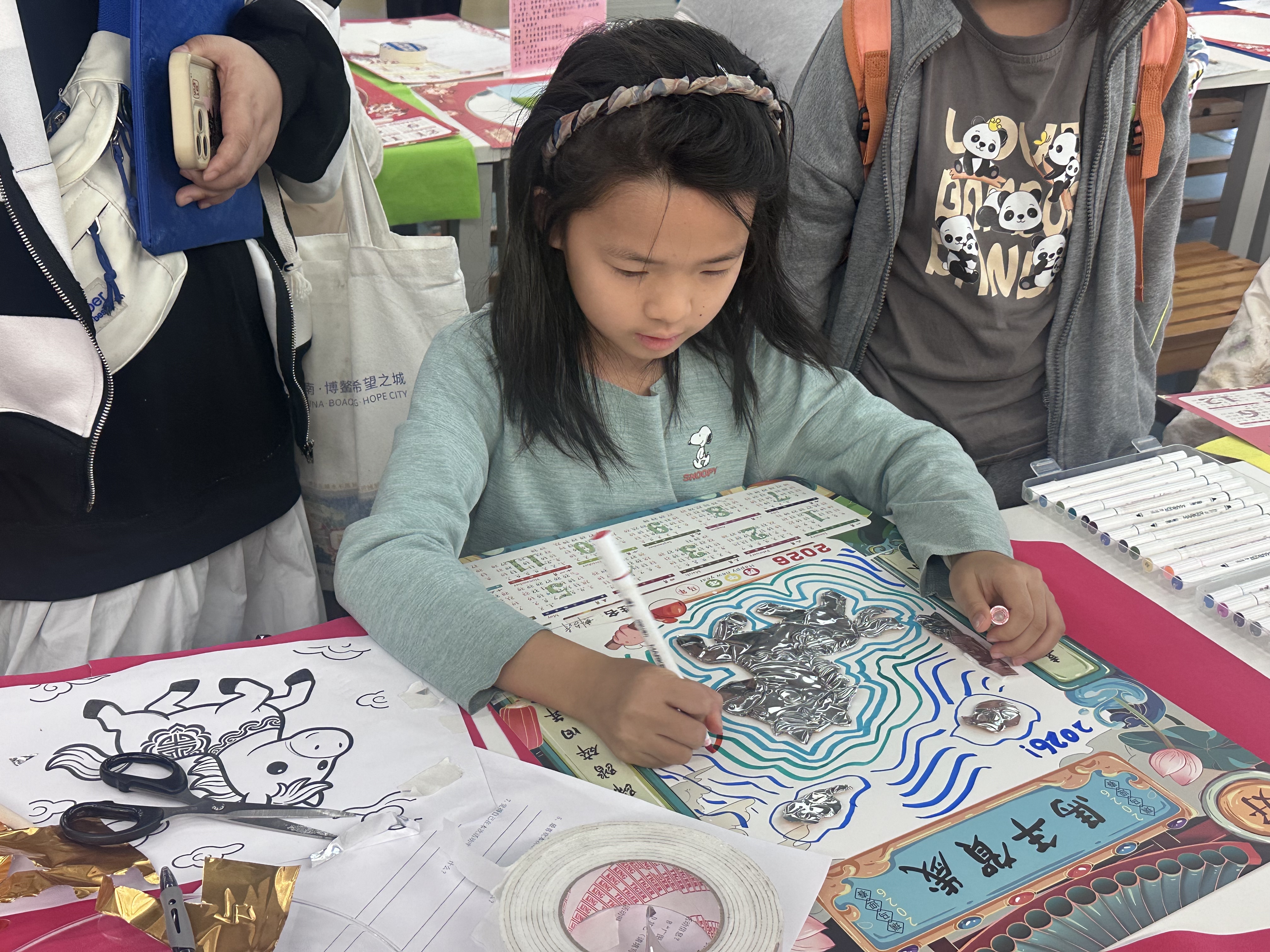 上午,馆员宋老师带着孩子们走进了“锡韵·日历”的奇妙世界。大家拿起铅笔和特制工具,在光亮的锡箔上专注地刻画。不一会儿,可爱的小动物、美好的新年祝福和各式吉祥花纹都像被施了魔法般浮现出来。亮闪闪的金属光泽让每张日历都独一无二,孩子们在光影变幻间,亲手点亮了这份特别的新年礼物。