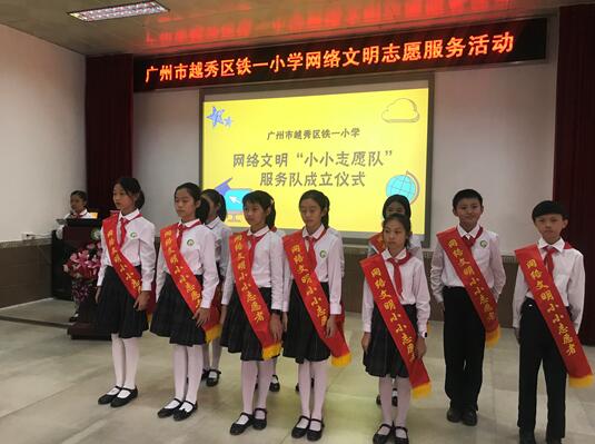 “我们是网络文明小小志愿者,我承诺,勤思考,善学习,做网络文明的示范者;明是非,辨真假,做网络文明的践行者;绿色网络我维护,文明上网我先行,共建清朗空间,传播网络文明”,在广州市越秀区铁一小学学生们朗朗的誓词声中,铁一小学网络文明“小小志愿服务队”正式成立。